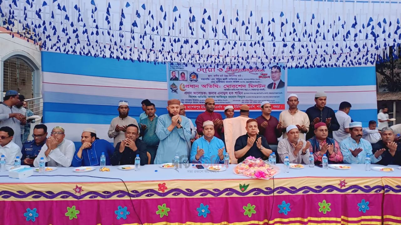 পবিত্র মাহে রমজান উপলক্ষে বগুড়ার শাজাহানপুর উপজেলার আশেকপুর ও খরনা ইউনিয়ন বিএনপির যৌথ উদ্যোগে এক ইফতার ও দোয়া মাহফিল অনুষ্ঠিত হয়েছে। স্থানীয় নেতাকর্মী, সমর্থক ও বিভিন্ন শ্রেণি-পেশার মানুষের অংশগ্রহণে অনুষ্ঠানটি প্রাণবন্ত হয়ে ওঠে।
