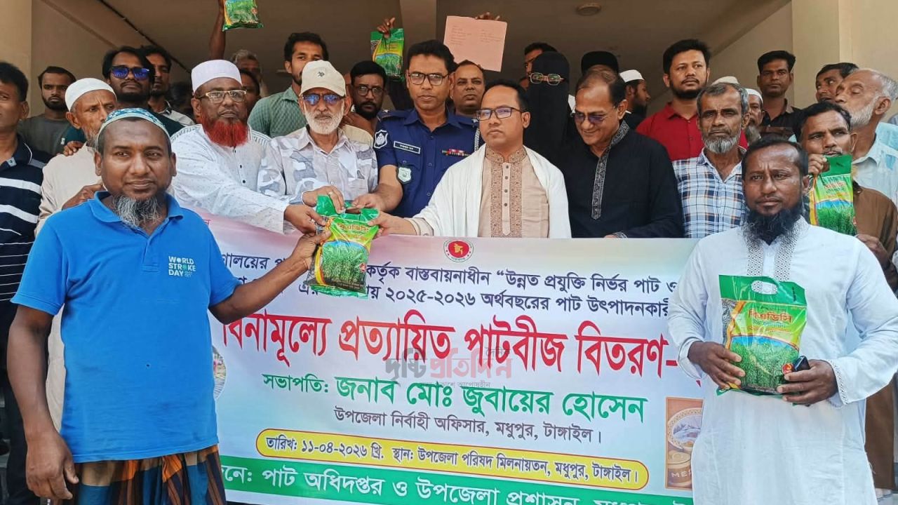 টাঙ্গাইলের মধুপুরের ২ হাজার ৪০২জন কৃষককে বিনামূল্যে পাটবীজ বিতরণ করেছেন উপজেলা প্রশাসন ও পাট অধিদপ্তর। সোনালী আঁশ পাটের সম্প্রসারণের জন্য শনিবার (১১ এপ্রিল) দুপুরে উপজেলা পরিষদ চত্বরে আনুষ্ঠানিকভাবে কৃষকদের হাতে এক থেকে দেড় কেজি পরিমাণ পাটবীজ তুলে দেওয়া হয়।