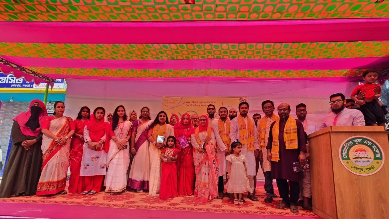 নতুন ভোরের নির্মল সূর্যোদয়ের সাথে সাথে নবীন-প্রবীণের প্রাণের স্পন্দনে সেজেছিল বগুড়া শেরপুরের প্রোগ্রেসিভ স্কুল এ্যান্ড কলেজ। বাঙালির হাজার বছরের ঐতিহ্য আর প্রাণের উৎসব পহেলা বৈশাখকে বরণ করে নিতে প্রতিষ্ঠানটি আয়োজন করেছিল শেকড় সন্ধানী এক বর্ণিল উৎসবের। দিনটির শুভ সূচনা হয় সকাল ৯টায় প্রতিষ্ঠানের সভাকক্ষে প্রথাগত পান্তা ভোজের মধ্য দিয়ে। মাটির ঘ্রাণ আর খাঁটি বাঙালিয়ানার আমেজে ইলিশ ভাজি, আলু ভর্তা, তিল ভর্তা, বাদাম ভর্তা এবং কাঁচা মরিচ ও পেঁয়াজের ঝালে সিক্ত পান্তা ভাতের আস্বাদ যেন সবাইকে যান্ত্রিকতা ভুলিয়ে ফিরিয়ে নিয়ে গিয়েছিল শেকড়ের টানে।